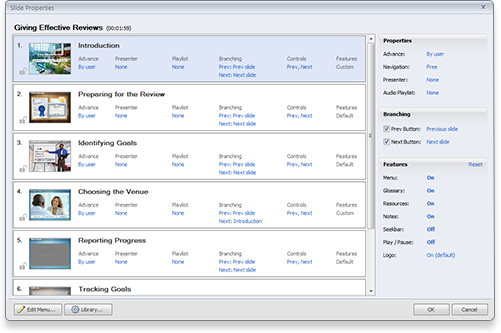 Articulate Studio 13中的Slide Properties頁面令人耳目一新。現在你可以爲每個頁面設置其頁面和功能組件,例如在某個頁面上是否需要顯示左側(cè)的目錄,是否需要上下頁導(dǎo)航按鈕等。這讓課件設計師有更大的發揮空間。